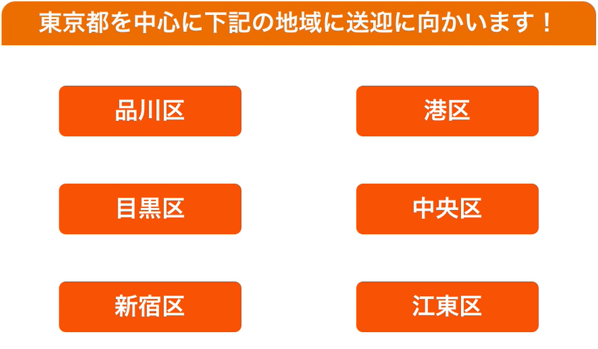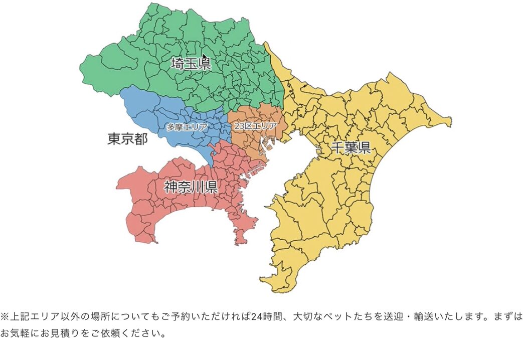 Cocoタクでは少しでも多くのペットを飼われている皆様のお役に立てるよう、主に品川区、港区、中央区、目黒区、品川区、江東区、千代田区を中心に、東京都内23区内外、また近隣エリアまで幅広く展開しております。